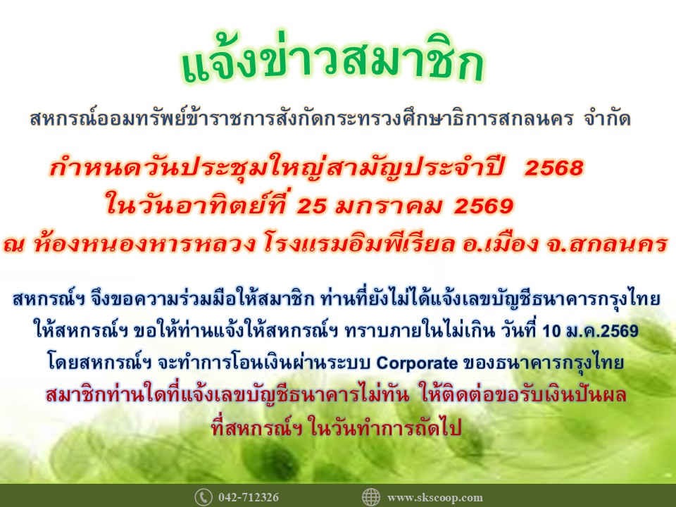 - ประกาศรายชื่อสมาชิกที่ได้รับทุนส่งเสริมการศึกษาบุตรสามาชิก ประจำปี 2568